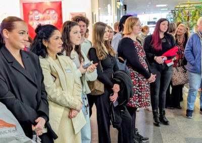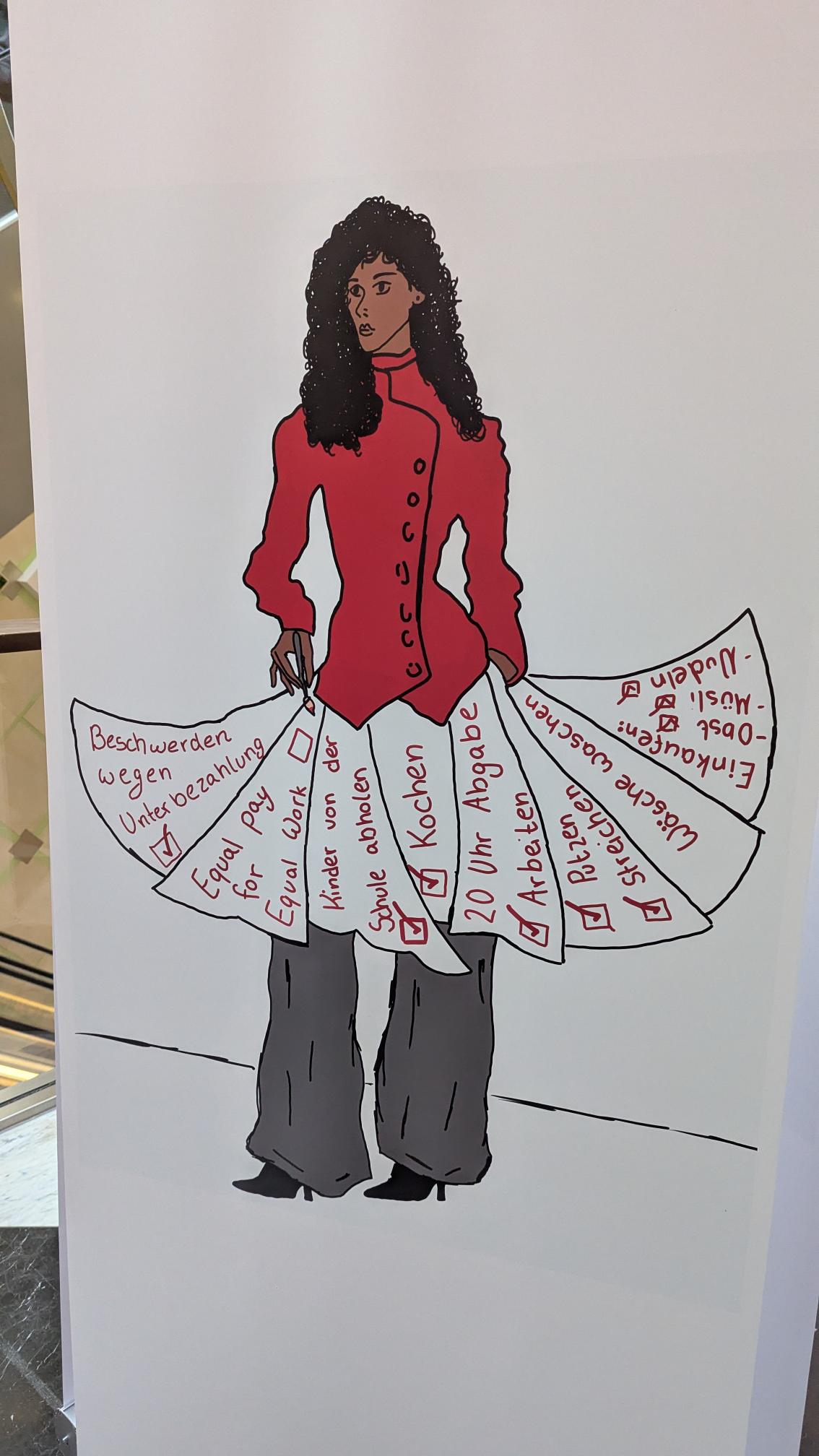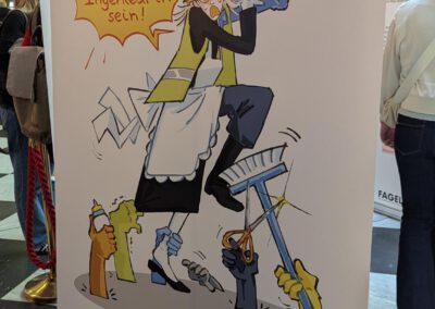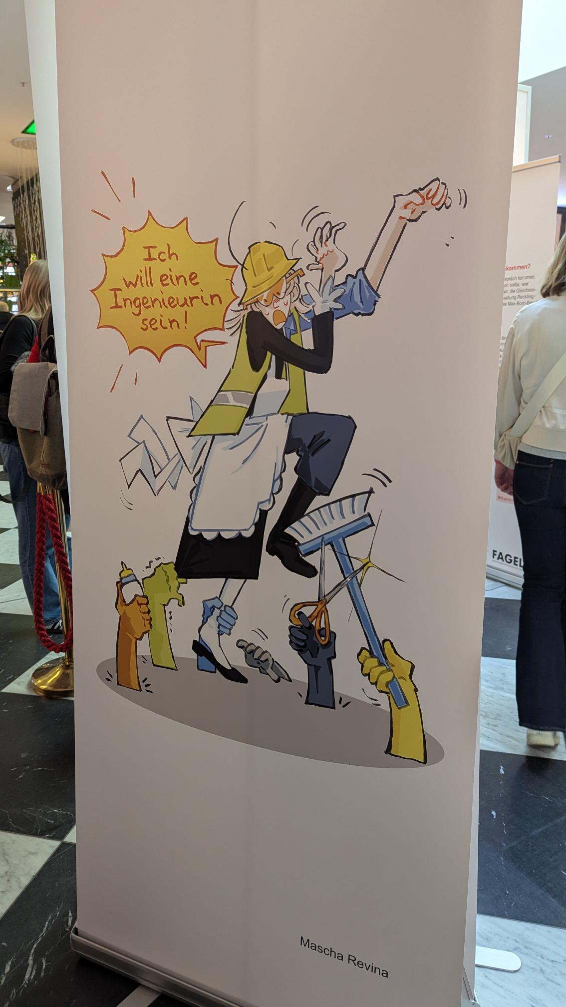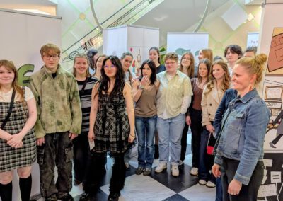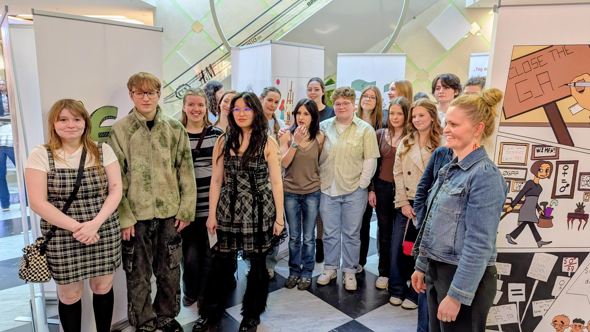 Am Freitag, den 27.02.2026, dem Equal Pay Day, haben Schülerinnen und Schüler der Jahrgangstufe 11 des Bildungsgangs GTA (AHR) im Palais Vest in Recklinghausen eine Ausstellung zum Equal Pay Day eröffnet. Dies ist der Tag, bis zu welchem Frauen im Gegensatz zu Männern quasi unentgeltlich arbeiten, und an dem die Schülerinnen und Schüler zusammen mit der Gleichstellungsstelle der Stadt- sowie der Kreisverwaltung Recklinghausen aufmerksam machen wollten. Um 8:30 Uhr kamen fleißige Schülerinnen und Schüler der Klassen A1G1 und A1G2 trotz Bus- und Bahnstreik ins Palais Vest angereist, um ihre auf Roll-ups gedruckten Werke vor der Rezeption im Erdgeschoss des Palais aufzustellen. Um 15 Uhr ging es dann los, und die Ausstellung wurde feierlich eröffnet. Die Gleichstellungsbeauftragten der Stadt- bzw. Kreisverwaltung Recklinghausen, Frauke Lindberg und Ilona Kalnik-Franke, eröffneten sie Ausstellung. Sie waren Anfang des Schuljahres an die Gestaltungsabteilung des Max-Born-Berufskollegs herangetreten, mit der Idee, diese Ausstellung ins Leben zu rufen. Auch die Managerin des Palais Vest Frau Ünlüçay war gekommen und richtete ein paar Worte an das Publikum. Anschließend gaben die Kunstlehrerinnen Elisa Scheerer und Gunda Schenk Einblicke in die Arbeit der vergangenen Monate, wie es zu der Ausstellung gekommen war, wie der kreative Prozess im Umgang mit dieser anspruchsvollen Aufgabe angeregt wurde, und wie die Schülerinnen und Schüler die Arbeiten letztendlich gestalterisch umgesetzt haben. Die Werke stellen unter anderem die strukturelle Ungleichheit in der Bezahlung von Frauen und Männern, aber auch stereotype Berufsbilder und die unbezahlte Sorgearbeit dar. Es sind visuelle Statements entstanden, welche sowohl inhaltlich als auch gestalterisch zum Nachdenken anregen. Es handelt sich um manuell oder digital gestaltete Zeichnungen, wobei jedes entstandene Werk einzigartig ist. Mal comichaft, mal als naturalistische Malerei oder auch mit Hilfe von KI, welche bei einem Werk zum Einsatz kam. Ein herzliches Dankeschön an alle Schülerinnen und Schüler der Klassen A1G1 und A1G2! Die Ausstellung kann noch bis zum Internationalen Frauentag, den 08.03.2026, im Palais Vest besichtigt werden.