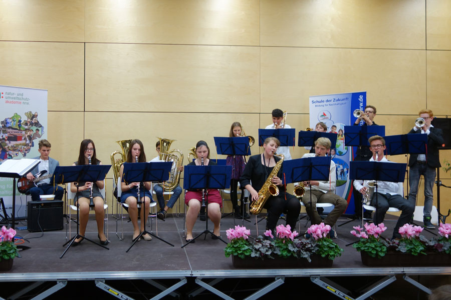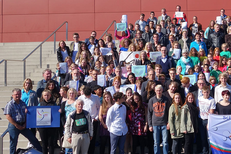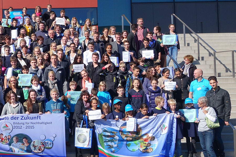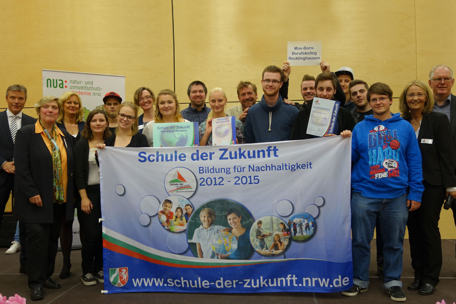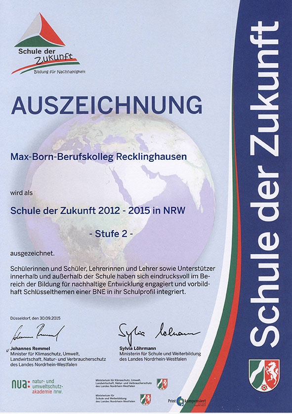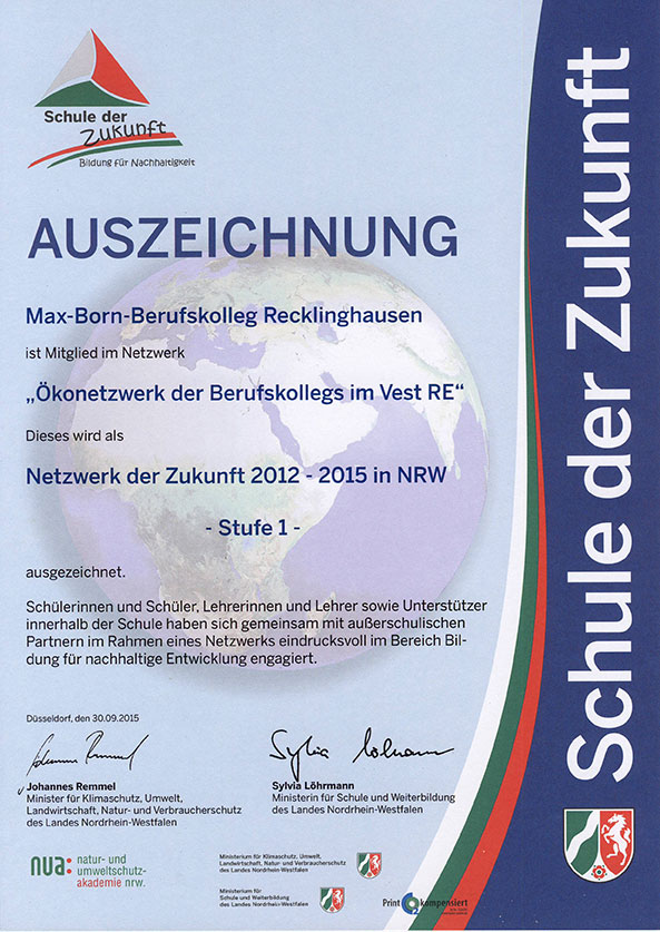 Im Dreijahresrhythmus werden Schulen vom Schulministerium für Projekte mit besonderer Ausstrahlung ausgezeichnet. Veranstalter ist die Natur- und Umweltschutz-Akademie NRW (NUA). Die aktuelle Kampagne „Schule der Zukunft – Bildung für Nachhaltigkeit“ endete am Mittwoch, den 30. September 2015, mit der Verleihung der Urkunden und der Zuerkennung des Qualitätsmerkmals “Schule der Zukunft”. Während der Übergabe sagte Frau Dr. Ursula Necker von der NUA sinngemäß: “Zukunft wird gestaltet, sichtbar in den dargestellten Projekten. Es wird einem warm bei so viel erneuerbaren Energien, die man beim Besuch der Stände aufnimmt.”. Die Veranstaltung fand erneut in den Räumlichkeiten des Max-Born-Berufskollegs statt, nachdem man bereits 2012 Gastgeber war. Insgesamt erhielten 14 Schulen des Kreises Recklinghausen und 6 Mitglieder des “Ökonetzwerks der Berufskollegs im Vest” Auszeichnungen. Das Max-Born-Berufskolleg wurde insgesamt für drei Projekte ausgezeichnet: