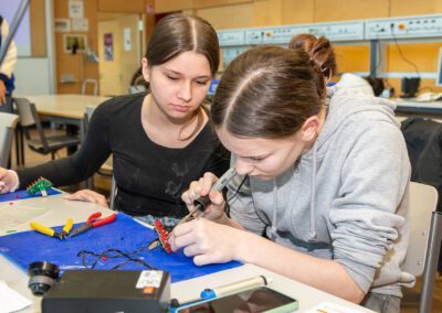 In der Elektrotechnik erhalten die Mädchen einen Lötbausatz, der speziell für Einsteiger/innen entwickelt wurde. Schritt für Schritt werden Bauteile wie Widerstände, LEDs und Schalter etc. auf die Platine gelötet. Am Ende haben die Mädchen eine eigene Solarleuchte entwickelt, und in ein Gurkenglas eingebaut – nachhaltig und funktional.