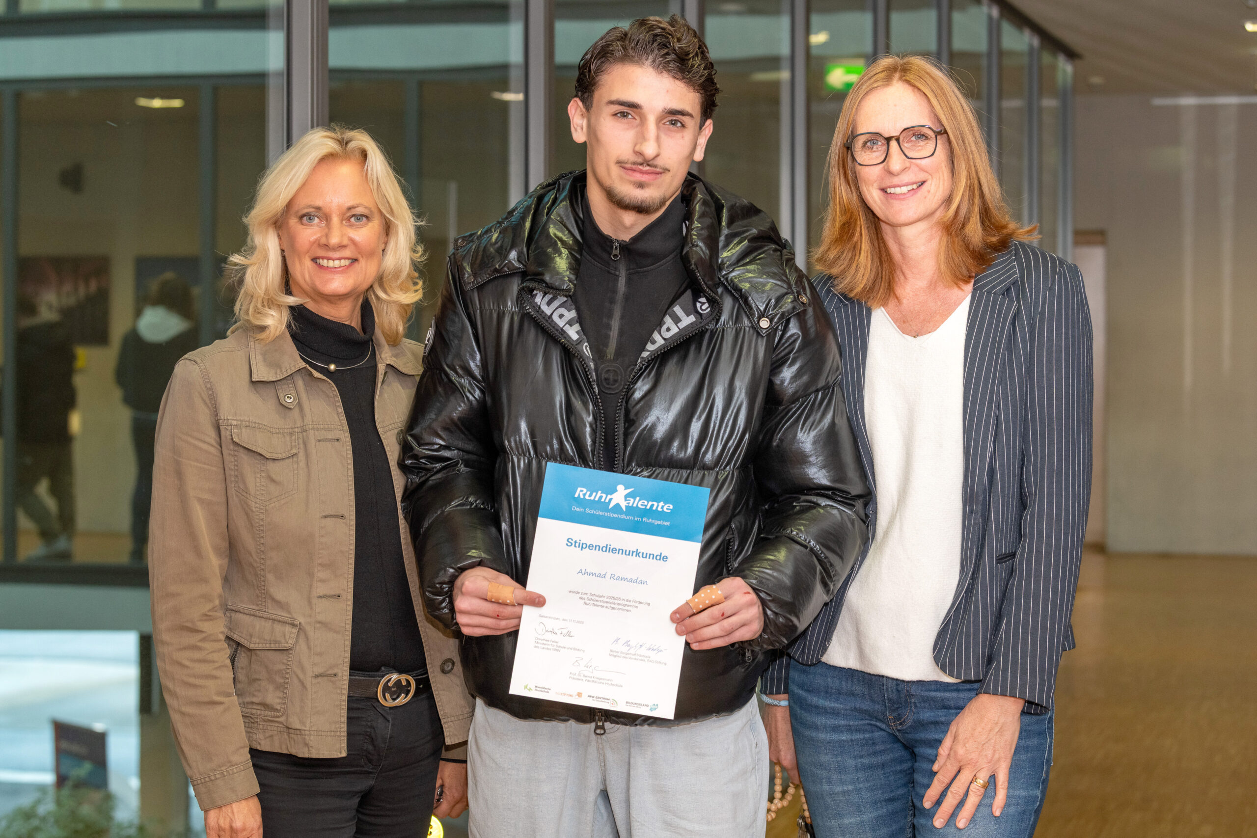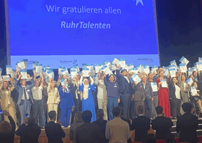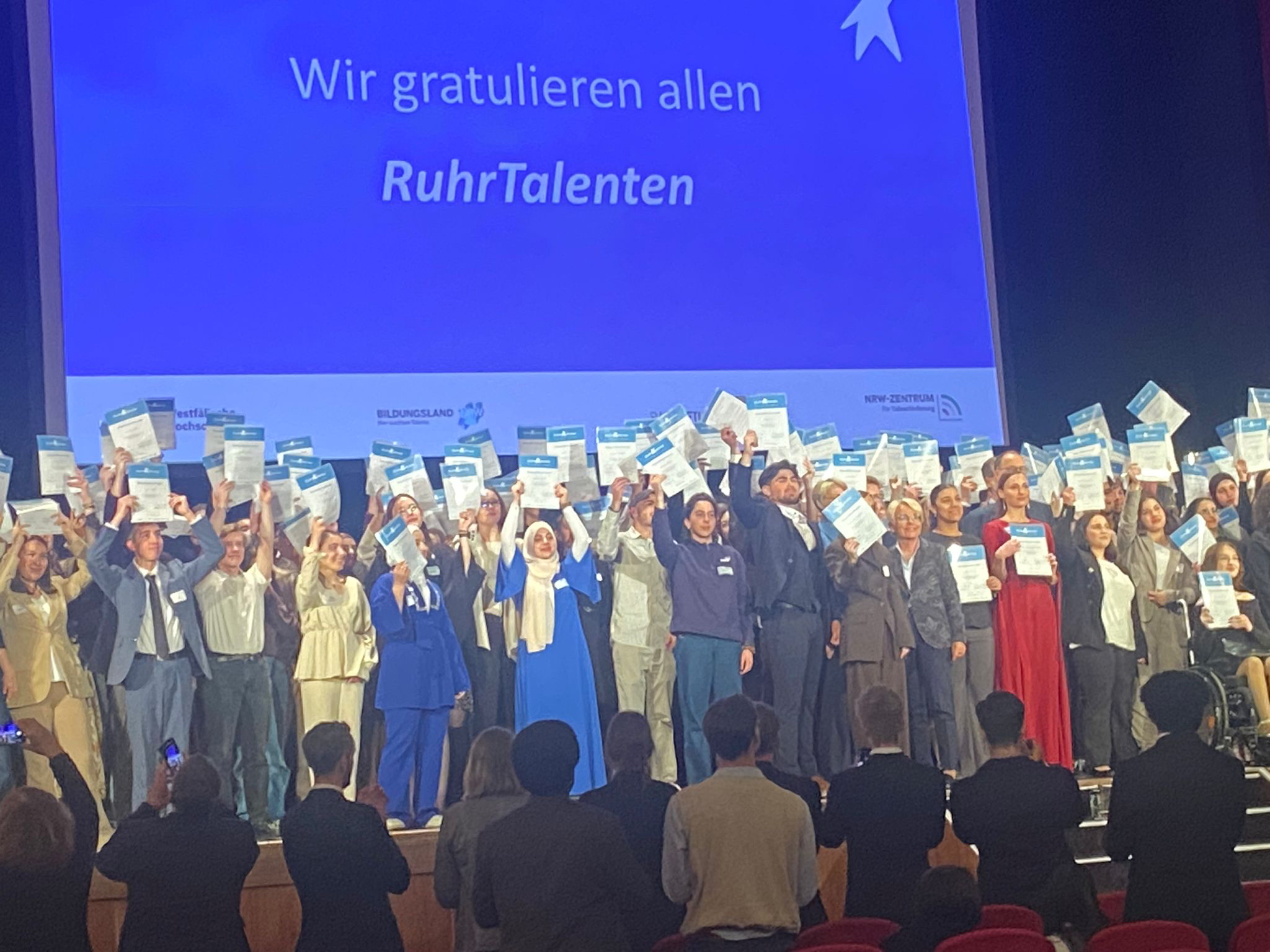Am Dienstag, den 11.11.2025, hat Ahmad Ramadan, Schüler der B2B1, im feierlichen Rahmen in der Lichtburg in Essen seine Ernennungsurkunde zum Ruhrtalent erhalten. Ahmad Ramadan: „Ich freue mich auf die Zukunft als Ruhrtalent. Ich bin mir sicher, dass es eine erfahrungsreiche und schöne Zeit wird und dass ich etwas aus dem Programm mitnehmen werde.‘‘ Wir gratulieren Ahmad Ramadan zur Aufnahme in das RuhrTalente-Schülerstipendienprogramm. Wir freuen uns mit ihm und wünschen ihm für seinen weiteren Schul- und Ausbildungsweg viel Erfolg und alles Gute.