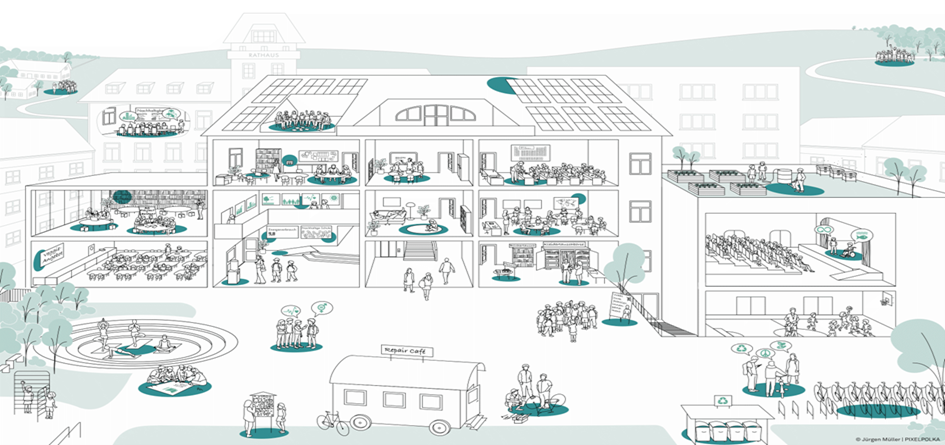 Es dient uns als visuelle Orientierungshilfe und Inspirationsquelle. Es zeigt eine utopische, aber erreichbare Schullandschaft, in der Nachhaltigkeit in allen Facetten sichtbar wird. Wir werden dieses Bild nutzen, um gemeinsam mit der Schulgemeinschaft unsere eigenen Schwerpunkte zu identifizieren.